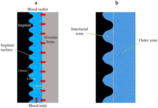 A two-dimensional geometrical model was generated using ANSYS Design Modeler (2019 R1, ANSYS Inc., Canonsburg, PA, USA) to mimic a bone–implant interface (Figure 1). The height and width of the model were 10.0 and 1.5 mm, respectively. The model was comprised of four boundaries and one fluid zone. The blood inlet, alveolar bone, implant surface, and blood outlet were demarcated as the boundaries. Whole blood flowed from the blood inlet and alveolar bone to blood outlet in the analysis. The implant surface had 10 threads. The height and width of each thread were 1.0 and 0.5 mm, respectively.
