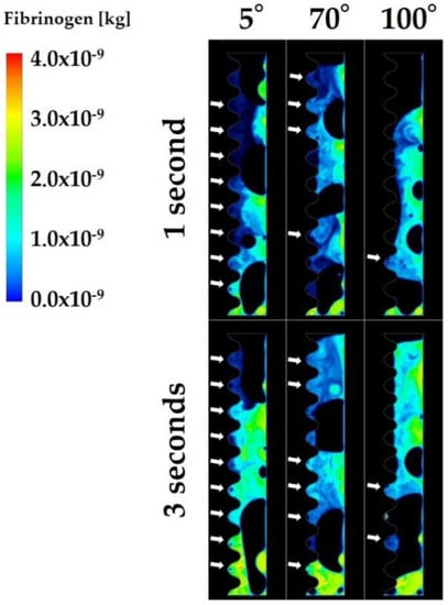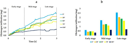Table 2 shows the time integrals of blood plasma infiltration and the ratio of the time integral to the value when the CAIS was 5° at each time stage. The changes in the blood plasma infiltration among three time stages were smaller than those of fibrinogen (Figure 6b and Table 2).