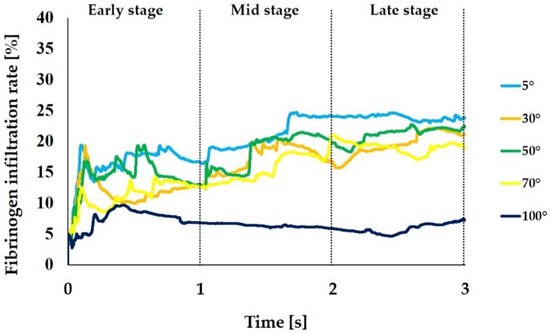 We calculated the infiltration rate for fibrinogen and blood plasma during each time step based on the mass of fibrinogen and blood plasma that were obtained in the analysis. Figure 4 shows the change over time of the fibrinogen infiltration rate. The average infiltration rate from the 3 s analysis was 20.4%, 16.2%, 17.9%, 15.3%, and 6.6% when the CAIS was 5°, 30°, 50°, 70°, and 100°, respectively, thus showing the substantially increased and decreased infiltration rates in the extreme conditions of 5° and 100°, respectively. Particularly, the 5° implant surface showed a substantial increase from the mid-to-late stage, whereas the 100° implant surface, surprisingly showed the progressive decrease with time.