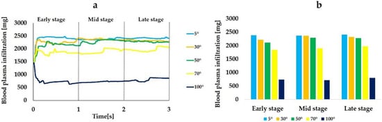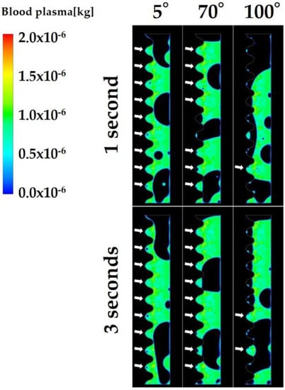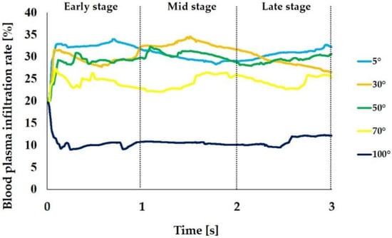 Figure 7 shows the blood plasma infiltration rate. The average blood plasma infiltration rate over time during the 3 s was 30.9%, 30.3%, 29.5%, 24.3%, and 10.6% when the CAIS values were 5°, 30°, 50°, 70°, and 100°, respectively. The rate increased in the beginning of the early stage and reached plateau during the early stage when the CAIS was 5°, 30°, 50°, and 70° while it decreased when the CAIS was 100°. Thus, the blood plasma infiltration rate showed the same tendency as the blood plasma infiltration.