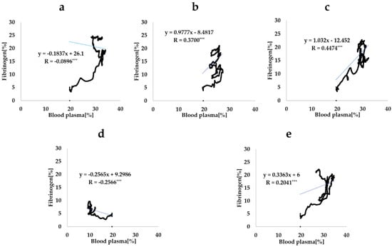 Scatter plots of the fibrinogen infiltration rate and blood plasma infiltration rate. The CAIS values are 0° (a), 30° (b), 50° (c), 70° (d), and 100° (e). Each dotted line is the regression line calculated from each scatter plot. R indicates the correlation rate (*** p < 0.001).