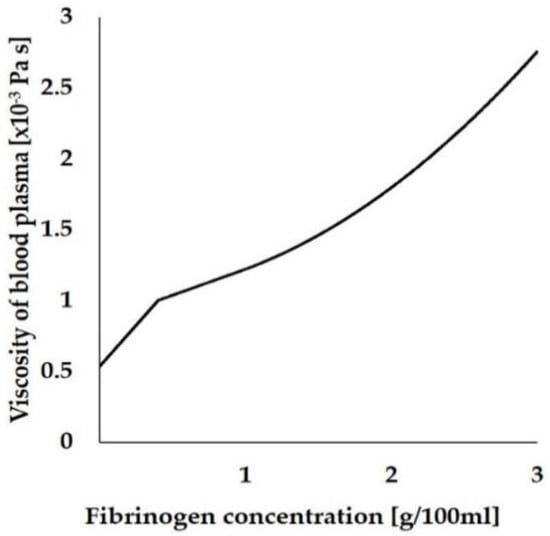 where the density of fibrinogen () and blood plasma (not including fibrinogen, ) were set as 1400 [36] and 1025 kg/m3 [32], respectively. The viscosity of the whole blood plasma, including fibrinogen ( Pa·S), was defined as a function of fibrinogen concentration, and expressed as Equation (4), which was derived from a previous study [37]. Figure 9 shows the relationship between and the concentration of fibrinogen.