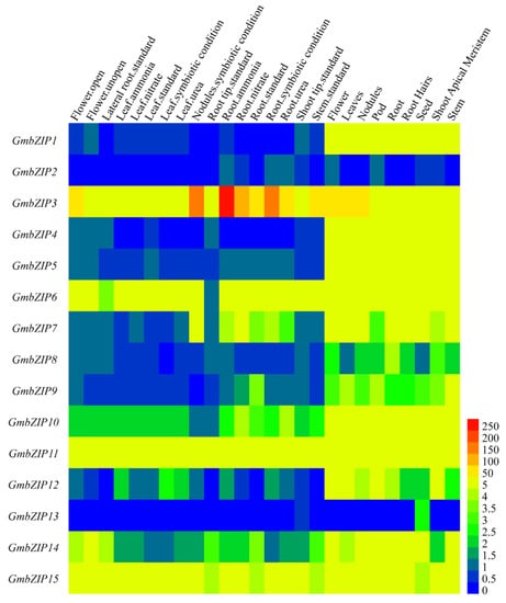 2.4. Tissue-Specific Expression Patterns of 15 GmbZIPs