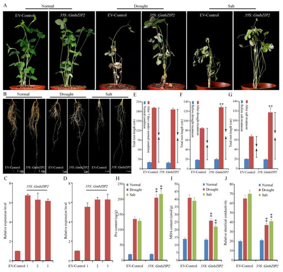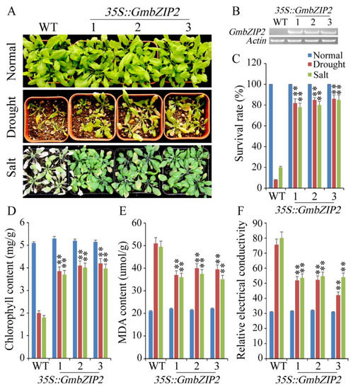 Yang, Y.; Yu, T.-F.; Ma, J.; Chen, J.; Zhou, Y.-B.; Chen, M.; Ma, Y.-Z.; Wei, W.-L.; Xu, Z.-S. The Soybean bZIP Transcription Factor Gene GmbZIP2 Confers Drought and Salt Resistances in Transgenic Plants. Int. J. Mol. Sci. 2020, 21, 670. https://doi.org/10.3390/ijms21020670