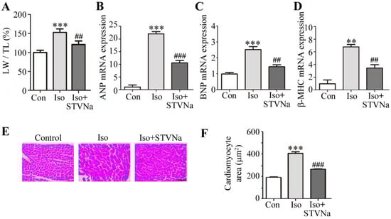 Iso is a non-specific β-adrenergic receptor agonist commonly used to induce cardiac hypertrophy []. Sprague-Dawley rats (n = 8) were injected with Iso at 5 mg/kg/d for 7 days to establish an in vivo model of cardiac hypertrophy. As shown in Figure 1, STVNa attenuated the Iso-induced changes. The LW/TL ratio was larger in Iso-treated rats than in the control group, and the HE staining revealed typical hypertrophic changes. The cardiomyocyte cross-sectional area was significantly increased, and co-treatment with STVNa decreased the LW/TL ratio (Figure 1A). The cardiomyocyte cross-sectional area (n = 30) tended to decrease in the left ventricle (Figure 1E,F). Iso-treated rats showed high expression of atrial natriuretic peptide (ANP), β-myosin heavy chain(β-MHC) and brain natriuretic polypeptide (BNP), whereas the level of these biomarkers was decreased in rats treated with STVNa (Figure 1B–D).