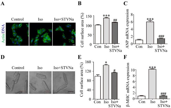 To explore the effect of STVNa on Iso-induced cardiac hypertrophy in vitro, we established a research model using the H9c2 cell line by exposing these cells to 10 µm Iso for 48 h. This led to a significant increase in cell surface area of H9c2 cells (n = 30), which was reversed by STVNa treatment (Figure 2A,B). Consistent with the results obtained from the H9c2 cells, we found that STVNa significantly reduced the cell surface area of primary rat cardiomyocytes (n = 30) isolated from the rat heart after Iso injection (Figure 2D,E). Our results also showed that STVNa significantly reduced the increase in ANP and β-MHC mRNA expression induced by Iso (Figure 2C,F). The above results suggested that STVNa may inhibit Iso-induced hypertrophy.