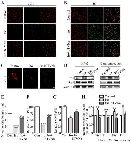 Effect of STVNa on mitochondrial integrity after Iso induction. Cells were seeded in 24-well plates and treated with JC-1 at 37 °C for 20 min to measure the Mitochondrial Membrane Potential (MMP). Confocal micrographs of JC-1 staining in H9c2 cells (A) and primary cardiomyocytes (B). Scale bar: 50 μm. (C) Mitochondrial morphology (scale bar: 10 μm) showing the length of mitochondria (E, n = 15). The results for relative mitochondrial membrane potential (MMP) were calculated using Zeiss 2012 imaging processing and 30 cells in each group were included. Data are shown as percentages of the control level. Images are representative of three independent experiments. 30 μg of total protein was used and the relative protein expression level were expressed as the ratio of target protein/ glyceraldehyde-3-phosphate dehydrogenase (GAPDH). (D) Western blot analysis and quantitative results (H) of mitochondrial fission-related proteins Fis1 and Drp1 in cardiomyoctyes and H9c2 cells. (F,G). The values shown in this graph represent means ± S.D. of data from three independent experiments. * p < 0.05, ** p < 0.01, *** p < 0.001 versus the control group; # p < 0.05, ## p < 0.01, ### p < 0.001 versus the Iso treatment group.