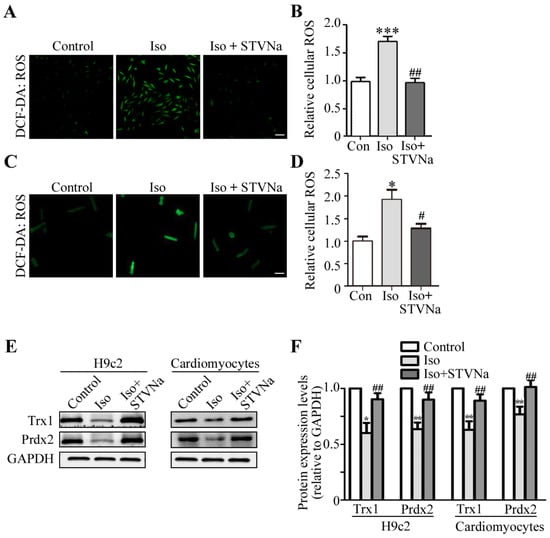 Prdx2 and Trx1 have been reported to be antioxidant factors in mammalian tissues. To understand how STVNa inhibited the ROS burst, we investigated the effects of STVNa on protein levels of Trx1 and Prdx2. In total, 30 μg of total protein was used and the relative protein expression level were expressed as the ratio of target protein/GAPDH. As shown in Figure 5E,F, the expression of Trx1 and Prdx2 markedly decreased in the Iso-treated group, but co-treatment with STVNa reversed this effect in H9c2 cells and cardiomyocytes when compared to the Iso group. Thus, we reasoned that STVNa treatment prevented cardiac hypertrophy by downregulating Prdx2 and Trx1 expression.