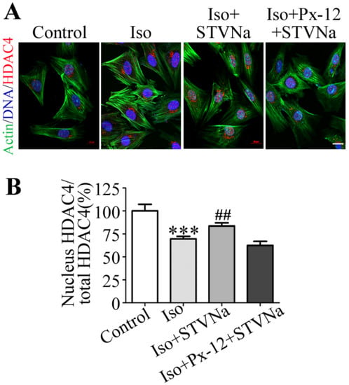 The translocation of class II histone deacetylases (HDACs) from the nucleus to the cytoplasm has been reported to be the terminal stage leading to cardiac hypertrophy []. Trx1 prevents cardiac hypertrophy by restoring the nuclear localization of class II HDAC4 oxidized []. The exact roles of Prdx2 and Trx1 during cardiac hypertrophy are not completely known. In this study, Immunofluorescence (IF) staining was used and our data showed that the ratio of nuclear HDAC4 to total HDAC4 was decreased in the Iso-induced group, and STVNa co-treatment increased this ratio. Furthermore, the ratio was not significantly different between Iso group and cells treated with PX-12 (a Trx1 inhibitor). The results were calculated by Zeiss 2012 imaging processing (n = 30). These findings suggest that STVNa inhibits Iso-induced cardiac hypertrophy by regulating the translocation of HDAC4 from the nucleus to the cytoplasm; inhibition of Trx1 prevents this effect.
