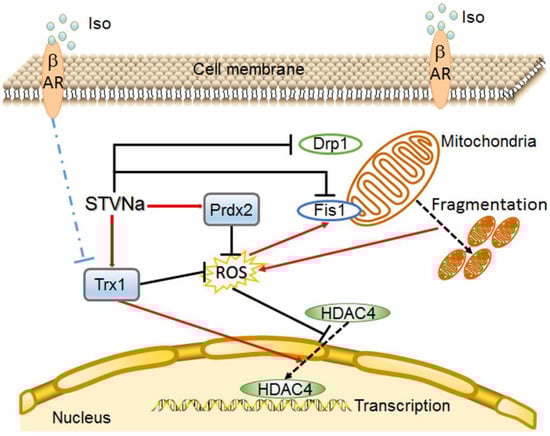 Mechanistic illustration of the effects of STVNa on Iso-induced cardiac hypertrophy. STVNa elevates Trx1 and Prdx2 expression, inhibits cellular ROS overload and ROS-induced cell mitochondrial fission, thus restoring MMP and mitochondrial morphology. This in turn decreases ROS expression. In addition, Trx1 reciprocally inhibits the translocation of HDAC4 from the nucleus to the cytoplasm, thus inhibiting cardiac hypertrophy induced by Iso. STVNa: isosteviol sodium; βAR: β-adrenergic receptor; Iso: Isoprenaline; Prdx2: Peroxiredoxin 2; Trx1: Thioredoxin 1; Fis1: mitochondrial fission 1; Drp1: Dynamin-related protein 1; HDAC4: histone deacetylase 4.
