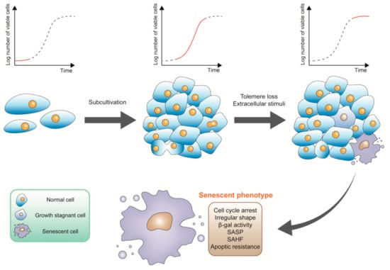 Cell senescence was first described by Hayflick in 1961. Primary cells undergo three phases during the period of culture: phase I, a period of slow proliferation before the first confluent sheet conformation; phase II, during which subcultivation is required for rapid cell proliferation; phase III, cell culture terminates with the permanent loss of proliferation potential of cells (Figure 1) [29]. To explain the reasons for the state of long-term growth arrest, which is referred to as phase III, Hayflick put forward the hypothesis that the limited lifetime of diploid cell lines in vitro may be indicative of aging or senescence at the cellular level [30]. Moreover, the senescence observed by Hayflick which is associated with telomere loss or dysfunction is termed “replicative senescence”. In the absence of telomere shortening, senescence can be also induced by some stimuli, since it arises before telomere shortening. This type of senescence is termed premature (Figure 1) [31]. It was later proved that there is also cell senescence in vivo, including mouse embryo mesonephros, endolymphatic sac of the inner ear, and apical ectodermal ridge of the limbs; human maternal-fetal interface, human rheumatoid arthritis tissues, human skin, disc, and lung [32,33,34,35,36,37,38].