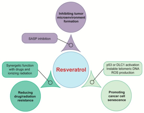 Potential functions of resveratrol in anti-tumor therapy. Resveratrol inhibit tumor microenvironment for cancer prevention, reduce drug/radiation resistance and induce cancer cell senescence for cancer therapy. SASP, senescence-associated secretory phenotype; DLC1, deleted in liver cancer1; ROS, reactive oxygen species.