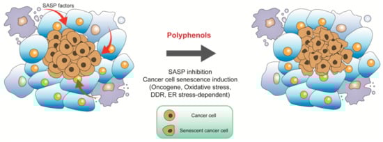 Polyphenols are ubiquitous in our diet and are an important source of anti-cancer compounds. Targeting senescence is an emerging anti-cancer strategy and polyphenols have a role in senescence regulation. This review is valuable in terms of clarifying mechanisms of polyphenols targeting senescence for cancer prevention and therapy. We concluded that polyphenols inhibit SASP factors secretion from senescent cells to form anti-tumor microenvironment to prevent cancer. Once tumorgenesis occurs, polyphenols are able to inhibit cancer by the mechanisms of oncogene-, oxidative stress-, DDR-, and ER stress-induced cancer cell senescence (Figure 3 and Figure 4). Concomitant usage of two polyphenols or a mixture of polyphenols and other anti-cancer drugs enhances therapeutic efficiency. Combined use of polyphenols or taking polyphenols as auxiliary compounds clinically will be a key consideration in the future.