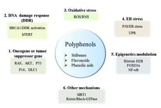 Cancer, a disease with a high incidence and mortality, has become one of the most significant health problems. From 2016 to 2017, cancer cases increased from 17.2 million to 24.5 million while the cancer death increased from 8.9 million to 9.6 million worldwide. In 2018, there were an estimated 18.1 million new cancer cases (17.0 million, except for non-melanoma skin cancer) and 9.6 million people died of cancer (9.5 million, except for non-melanoma skin cancer) in 185 countries [1,2,3], which indicates that there are still huge challenges in cancer treatment. Because of the universal non-specific effects and inevitable toxicity of cancer drugs nowadays, tissues adjacent to cancer will be implicated and the normal cell will be killed simultaneously when cancer cells are scavenged. It is of great significance to discover or design new agents with low toxicity to normal cells and effective therapy of cancer. Increasing the number of natural compounds has been highly valued for their anti-cancer properties. Seeing that compounds derived from natural sources are easily available, inexpensive, biologically active, and mildly toxic, they are expected to be potential chemotherapeutic drugs in the future. Polyphenolic compounds, generally discovered from plants, are synthesized to adapt the stressful and pathogenic environmental situations [4]. They are characterized by more than one connected hydroxylated/multi-hydroxylated benzene ring-phenol, and are classified into four different groups based on their structural properties: phenolic acids, stilbenes, lignans, and flavonoids [5]. Currently, the anti-tumor profile of polyphenols puts them in the spotlight of research fields. Polyphenols exert their potential in anti-cancer therapy via promoting apoptosis, regulating autophagy, inhibiting proliferation and migration, and so on. The mechanisms include epigenetic modulation as well. For instance, plant polyphenol curcumin regulated miRNA related to tumorigenesis, induced global hypomethylation, and decreased histone deacetylases (HDACs) expression to inhibit the cell proliferation, metastasis, angiogenesis, and induce apoptosis in cancer cells [6,7,8,9]. Oleacein, one of olive oil polyphenols, promoted histone acetylation, inhibited clonogenicity, induced cell cycle blockade, and apoptosis in human multiple myeloma cells [10,11]. Epigallocatechin-3-gallate, a major component of green tea polyphenols, downregulated expression of human telomerase reverse transcriptase (hTERT), a major enzyme determining telomere stability, through causing promoter hypomethylation and histone deacetylations, thereby inhibiting proliferation of breast cancer cells [12]. Polyphenols extracted from Annurca apple selectively inhibited the viability of MDA-MB-231, a triple negative human breast carcinoma cell line, by causing G2/M phase arrest, inducing intrinsic and extrinsic apoptosis and beclin-1-independent autophagy [13]. The polyphenolic-rich pinus radiata bark extract induced caspase-independent apoptosis-like cell death in MCF-7 human breast carcinoma cells [14]. Resveratrol-rich red wine polyphenols also have been shown to cause acute lymphoblastic leukemia cells growth stagnation and promote apoptosis [15]. Blueberry fermentation products which contain enriched polyphenols inhibited proliferation, mammosphere formation, cell mobility, and cell migration potential in breast cancer cells, and reduced tumor development and metastasis in mice [16]. Trials of resveratrol have been completed on phase 1 of clinical studies in malignant hepatic tissue and confirmed its pharmacological efficacy [17]. In an intervention trial, fumonisin B1, a class 2B carcinogen, was significantly decreased in the blood and urine of people treated daily with green tea polyphenols capsules, which means the polyphenols are effective in inhibiting carcinogen-induced tumorigenic effects [18]. Collectively, polyphenols are significantly involved in cancer prevention and therapy.