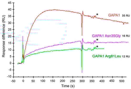 Comparison of the abilities of wild-type (WT) GAPA1 (red line), point-mutated GAPA1 Asn35Gly (pink line) and GAPA1 Arg81Leu (green line) to bind immobilised 3-AESA in SPR assays. All proteins were injected at 50 nM concentrations. In these sensorgrams, the signal from the mock-coupled surface was subtracted. The response values of the report points (*) after the beginning of the dissociation phase were extracted. The corresponding relative responses are indicated in Resonance Units (RU). The report points are indicated by *.