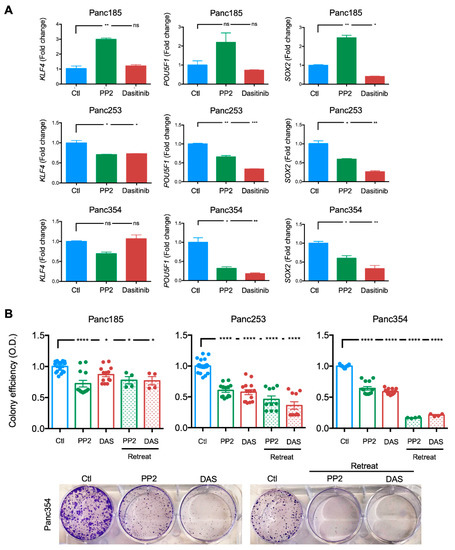 2.4. Inhibition of SRC Kinases Reduces the Percentage of PaCSCs, Pluripotency-Associated Gene Expression, and Colony Formation Efficiency