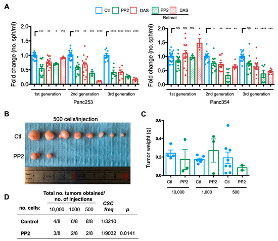 2.5. SRC Kinase Inhibition Reduces PaCSC Self-Renewal and Tumorigenesis