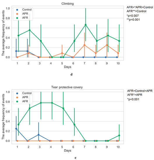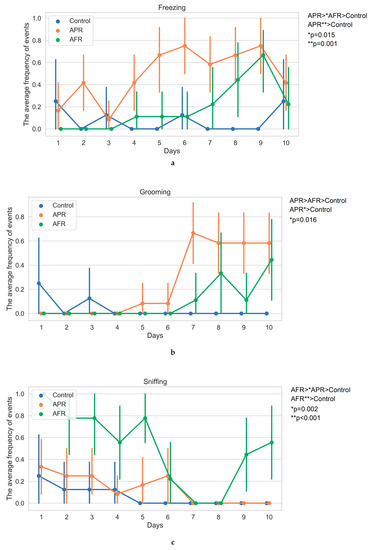 After 10 days of PSS induction, hetero-chronic changes were revealed in AFR rats, which manifested a rise in climbing (with peaks on days 1–3 and 6–7; Figure 1d) and sniffing acts (with peaks on days 1–5 and 9–10; Figure 1c) and episodes of tearing/aggressive behavior (day 1–6; Figure 1e) in comparison to APR rats. AFR rats displayed decreased frequency of freezing on days 2 and 5–6 in comparison to APR rats (Figure 1a), while the latter demonstrated higher numbers of grooming behavior acts on days 7 and 9 in comparison to AFR animals (Figure 1b). In AFR rats, an upward trend in the incidence of grooming was determined (the number of grooming acts at the final stages of the experiment exceeded the ones of the initial stages). Thus, in the dynamics of 10-day PSS, only the aggressiveness was characterized by the presence of traits in AFR rats, with complete absences in APR rats. Other characteristics were revealed in both phenotypes, although with different intensities. This is why we identified the dominant behavioral patterns in the two phenotypes of rats, evaluating the differences in the summarized numbers of behavioral acts during the 10 days of PSS exposure.