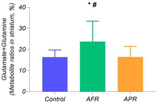 Magnetic resonance spectroscopy (MRS) analysis using a one-way ANOVA (Figure 2) revealed significant differences in summarized Glu+glutamine (Gln) metabolites in striatum (F2,26 = 6.97; p < 0.001), with higher Glu+Gln levels in AFR (24.94 ± 9.51%, n = 9) than in APR rats (17.02 ± 5.19%, n = 12; p < 0.005) and when compared with control rats (16.37 ± 3.35%; p < 0.005), while there were no differences in Glu+Gln levels in APR rats in comparison to control animals.