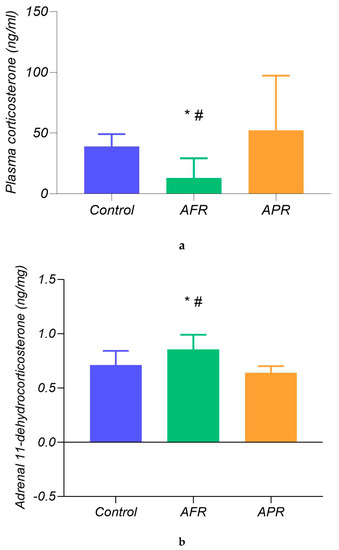 Comparison of peripheral corticosteroids 18 days after PSS. Legend: (a) Plasma CORT levels (ng/mL) and (b) adrenal 11-dehydrocorticosterone levels (ng/mg of tissue). # p < 0.05 AFR (n = 9) in comparison to APR (n = 12).); * p < 0.05 in comparison to control (n = 8).