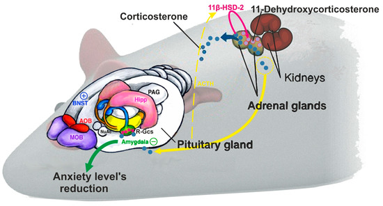 The second pathway may be linked to tissue metabolism of GCs by the 11β hydroxysteroid dehydrogenases (11βHSD) type 1 (11βHSD1) and type 2 (11βHSD2), which are involved in the interconversion between active and inactive forms of GCs, depending on the tissue. Thus, the active form of CORT is metabolized by 11βHSD2 to the inactive form 11-dehydrocorticosterone, while the reverse reaction from an inactive to an active form is catalyzed by the 11βHSD type 1 enzyme [28,29]. The adrenal cortices express both 11βHSD1 and 11βHSD2, which may be involved in not only activating, but also inactivating, calming reactions of the stress response. This suggests that the latter may also take place at the level of the end-organ of the LHPA axis, possibly via a regulated decrease of active GC secretion.