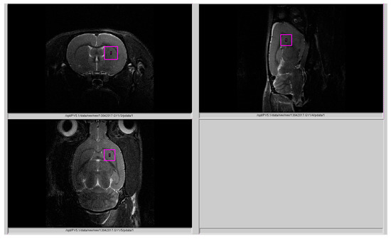 Rat striatum neurometabolites (Figure 2) were measured on a horizontal tomograph with a magnetic field of 11.7 tesla (Bruker, Biospec 117/16 USR, Germany). The rats were anesthetized with gas (isoflurane; Baxter Healthcare Corp., Deerfield, IL, USA) using a Univentor 400 Anesthesia Unit (Univentor, Zejtun, Malta). The tomographic table contained a water circuit that maintained a surface temperature of 30 °C to preserve animal body temperature during the test. A pneumatic respiration sensor (SA Instruments, Stony Brook, NY), placed under the lower body, controlled the depth of anesthesia. Proton spectra of the rat striatum were recorded with transmitter volume (T11232V3) and rat brain receiver surface (T11425V3) using 1 Hz radiofrequency coils (Bruker, Ettlingen, Germany). High-resolution T2-weighted images of the rat brain in three (axial, sagittal, and coronal) dimensions (section thickness, 0.5 mm; field of view, 2.5 × 2.5 cm for axial and 3.0 × 3.0 cm for sagittal and coronal sections; matrix of 256 × 256 dots) were recorded by rapid acquisition with relaxation enhancement (TurboRARE), with the pulse sequence parameters TE = 11 ms and TR = 2.5 s for correct positioning of the spectroscopic voxels. Voxel dimension was 3.0 × 3.0 × 3.0 mm for the striatum. Voxel was manually placed according to a structural T2-weighted MRI image (Figure 5). All proton spectra were recorded by spatially localized single-voxel stimulated echo acquisition mode (STEAM) spectroscopy, with the following pulse sequence parameters: TE = 3 ms, TR = 5 s, and 120 accumulations. Uniformity of the magnetic field was tuned within the selected voxel using FastMap [56] before each spectroscopic recording. The water signal was inhibited with a variable pulse power and optimized relaxation delays (VAPOR) sequence [57].