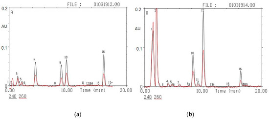 Chromatographic separation of a mixture of standards (a): 7-aldosterone, 9 – 11-dehydrocorticosterone, 10-corticosterone, and 16 – 11-desoxycorticosterone; and adrenal extracts (b): 5-aldosterone, 11 – 11-dehydrocorticosterone, 12-corticosterone, and 16 – 11-desoxycorticosterone. The black line corresponds to absorption at 240 nm, the red line to absorption at 260 nm. The y-axis is absorption (A) in absorption units (AU); the x-axis is time in min.