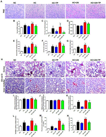 Compared to normal control (NC), HC and HC+UN yielded increased lipid droplets in the kidney, showing higher levels with HC+UN versus HC (Figure 1H). Kidney TC was higher with HC and HC+UN versus NC, and was reduced by TP in the HC+UN+TP group (Figure 1I). Free cholesterol did not differ among groups. HC and HC+UN showed trends of increased kidney cholesterol esters (Figure 1J,K). TP decreased kidney cholesterol accumulation, consistent with decreased serum TC, LDL, and TG. The HC diet significantly elevated XO activity, dichlorodihydrofluorescein diacetate (DCFDA), and H2O2 excretion in kidney tissue, which were higher with HC+UN versus HC. TP decreased the increased XO activity and intracellular oxidative stress markers (Figure 1L–N).