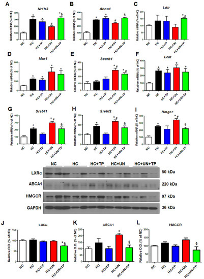 Compared to NC, the HC diet groups exhibited increased mRNA expression of genes related to cholesterol efflux (Nr1h3 and Abca1), LDL and modified LDL uptake (Ldlr, Msr1, and Scarb1), TG synthesis (Srebf1), and cholesterol synthesis (Srebf2 and Hmgcr) (Figure 2A–I). HC+UN yielded decreased Nr1h3 and Abca1 (Figure 2A,B), increased Msr1 and Scarb1, and decreased Ldlr expression (Figure 2C–E). Lcat expression was increased with the HC diet versus normal diet but did not differ between HC and HC+UN (Figure 2F). HC+UN yielded increased Srebf1, Srebf2, and Hmgcr expression (Figure 2G–I). TP treatment (HC+UN+TP) increased Nr1h3 and Abca1 expression, and decreased Srebf1, Srebf2, and Hmgcr expression (Figure 2A,B,G–I). The HC diet led to increased ABCA1 and HMGCR protein levels, which were higher with HC+UN versus HC. LXRα protein levels were not altered by HC diet (Figure 2J–L). Overall, TP treatment yielded increased cholesterol efflux gene expression and reduced cholesterol synthesis gene expression (Figure 2).