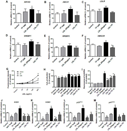 LDL increased NR1H3, ABCA1, and HMGCR expression in human kidney proximal tubule epithelial (HK-2) cells, without affecting LDLR, SREBF1, or SREBF2. TP decreased only HMGCR expression (Figure 3A–F). LDL increased intracellular ROS over the basal level, which peaked at 30 min (Figure 3G), with elevated H2O2 level and ROS-dependent DCF fluorescence intensity. TP reduced cellular ROS, similar to the positive control NAC (Figure 3H–I).