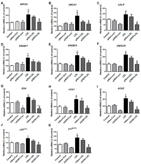 The effects of small interfering RNA against XDH (siXDH) on cholesterol metabolism and oxidative stress in LDL-stimulated HK-2 cells. After transfection with siXDH (20 μM) for 24 h, and stimulation with LDL (200 μg/mL) for 30 min, real-time RT-PCR was performed to determine expression levels of cholesterol efflux genes (A,B), LDL receptor (C), triglyceride synthesis (D), cholesterol synthesis (E,F), XDH (G), NOX1 (H), NOX2 (I), and the NADPH oxidase subunits p22phox (J) and p47phox (K). Differences among the groups were analyzed by one-way non-parametric ANOVA, followed by Tukey’s multiple comparison test. Data represent mean and SEM. * p < 0.05 vs. control, § p < 0.05 vs. LDL. LDL, low-density lipoprotein.