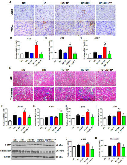 We evaluated the inflammatory responses to high cholesterol and oxidative stress in the kidney of a CKD model. The HC diet increased inflammation cytokines (e.g., TNF-α) and the macrophage monocyte marker CD68, which were higher with HC+UN versus HC (Figure 5A). Expressions of the inflammation-related genes Il-1β, Il-18, and Nlrp3 were also increased with HC+UN versus HC. TP reduced inflammation-related gene expression in uninephrectomized mice (Figure 5B–D). Compared to NC, HC groups showed progression in the fibrosis of glomeruli and interstitium, which was greatest with HC+UN, and was reduced by TP (Figure 5E). Compared to HC, HC+UN yielded increased Acta2, Col1, and Fn1 expressions (Figure 5F–I). Fibronectin and α-SMA protein expressions were not significantly increased in the HC+UN group (Figure 5J,K).