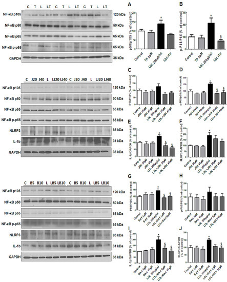 Finally, we evaluated the effects of LDL on the NF-κB pathway [17], downstream of TNF-α. LDL-stimulated HK-2 cells showed increased NF-κB p50 and NF-κB p65 levels, which were decreased by TP (Figure 6A–B). We also investigated the NF-κB inhibitors JSH23 and BAY11-7082. In LDL-treated HK-2 cells, JSH23 treatment significantly decreased NF-κB p65, and IL-1β, but did not affect NLRP3 and NF-κB p50 (Figure 6C–F), while BAY11-7082 treatment reduced NF-κB p50, IL-1β, and NLRP3 levels, but did not affect NF-κB p65 (Figure 6G–J).