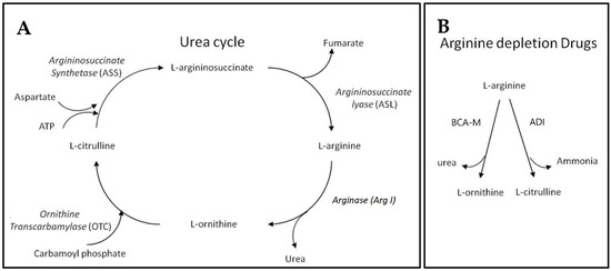 Urea cycle and L-arginine depletion drugs. (A) The urea cycle where L-arginine may be catabolized and regenerated. (B) The different actions of L-arginine depletion drugs resulting in different metabolites that may enter different steps of the urea cycle for L-arginine regeneration.