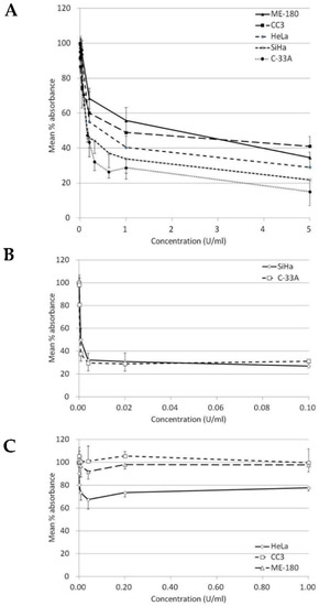 Our results indicated that BCA-M significantly inhibited the growth of all five tested human cervical cancer cell lines after 72-h incubation (Table 1 and Figure 2A). The maximum percentage mean suppression (max. %) within the tested dose ranges for C-33A, SiHa, HeLa ME-180 and CC3 cells were 85%, 78%, 71%, 65% and 59%, respectively. IC50 values calculated from the non-linear regression model ranged from the lowest of 0.19 U/mL in C-33A cells to the highest of 1.42 U/mL in ME-180 cells. Both IC50 values and max. % indicated a similar trend of drug susceptibility in the order of C-33A > SiHa > HeLa > CC3 ~ ME-180. On the other hand, ADI only showed effective inhibition on the growth of SiHa and C-33A cells but were highly resisted by the remaining cell lines even at a 10-fold higher maximum concentration tested than the two sensitive cell lines (Table 1, Figure 2B,C).