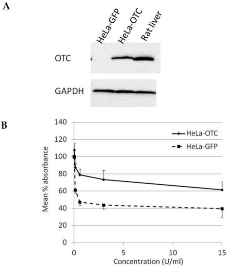 Over-expression of OTC conferred significant resistance towards the growth suppressive effect of BCA-M on HeLa cells. (A) The over-expression of OTC in transduced HeLa cells was confirmed by western blotting. Protein samples from HeLa cells expressing GFP and rat liver were used as negative and positive controls, respectively. (B) The results of cell proliferation assay for transduced HeLa cells expressing OTC or control GFP are represented by the mean % absorbance and S.D.
