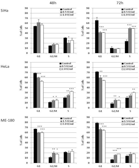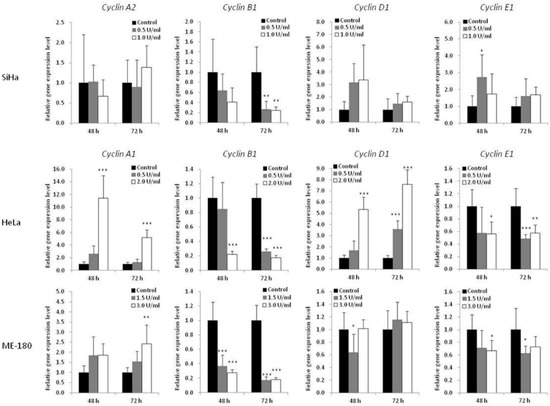 To further understand the mechanism of BCA-M-induced cell cycle arrest, the transcriptional regulations of cyclin genes were analyzed using quantitative real-time PCR (Figure 6). The expression levels of cyclin A1 (CCNA1) were studied for HeLa and ME-180 cells while that of cyclin A2 (CCNA2) was studied for SiHa cells. The expression levels of cyclin B1 (CCNB1), cyclin D1 (CCND1) and cyclin E1 (CCNE1) were also determined for all these cell lines. For SiHa cells, BCA-M treatment resulted in the significant down-regulation of cyclin B1 expression after incubation for 72 h with both tested concentrations. For HeLa cells, 2.0 U/mL of BCA-M treatment significantly down-regulated the gene expressions of cyclin B1 and cyclin E1, with concomitant up-regulation of cyclin A1 and cyclin D1 after incubation for 48 and 72 h. For ME-180 cells, BCA-M significantly down-regulated cyclin B1 expression after treatment for 48 and 72 h with both tested concentrations. There was also a slight down-regulation of cyclin E1 and up-regulation of cyclin A1 expressions at both 48 and 72 h with or without statistical significance.