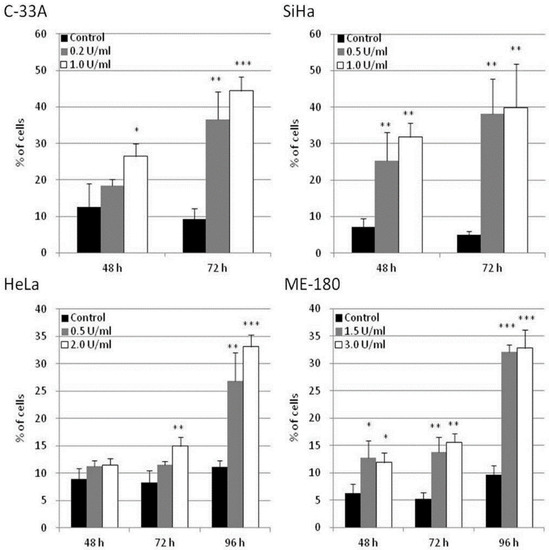The potential of apoptosis induction by BCA-M treatment in human cervical cancer cells was explored in C-33A, SiHa, HeLa and ME-180 cells using flow cytometric analysis with annexin V-FITC and propidium iodide staining. Owing to the different drug susceptibilities of these cancer cells and to optimize the detection of cellular responses, the cancer cells were treated with BCA-M at different doses and times chosen specifically for them. Our results showed that BCA-M significantly induced apoptosis in all the tested cell lines that have different drug susceptibilities and urea cycle gene expression profiles (Figure 7 and Figures S4–S7). For the relatively more susceptible C-33A and SiHa cells, BCA-M treatment resulted in a significant increase in the proportion of apoptotic cells in a time-dependent manner. For C-33A cells, massive apoptosis with 44.4 ± 3.8% of apoptotic cells was observed at 72 h incubation with 1.0 U/mL BCA-M treatment. For SiHa cells, massive apoptosis was also observed after 48 h incubation with 31.8 ± 3.8% of apoptotic cells and increased up to 39.9 ± 11.9% after 72 h with 1.0 U/mL BCA-M treatment. However, for the relatively less susceptible HeLa cells, a significant increase in the proportion of apoptotic cells was first observed after 72 h treatment with 2.0 U/mL BCA-M and massive apoptosis with a maximum of 33.2 ± 2.1% apoptotic cells appeared sharply after 96 h BCA-M treatment. Finally, for the relatively less susceptible ME-180 cells, although a significant increase in the proportion of apoptotic cells has been detected for all time points after 48 h, the percentage of apoptotic cells observed for 48 and 72 h was relatively low up to 15.6 ± 1.5%. Similar to HeLa cells, massive apoptosis was observed for ME-180 cells after 96 h with 3.0 U/mL BCA-M treatment resulting in a maximum of 32.8 ± 3.3% apoptotic cells. Therefore, the results for the extent of BCA-M-treatment-induced apoptosis showed certain correlations with the drug susceptibilities of the cell lines measured using MTT-based cell proliferation assays.