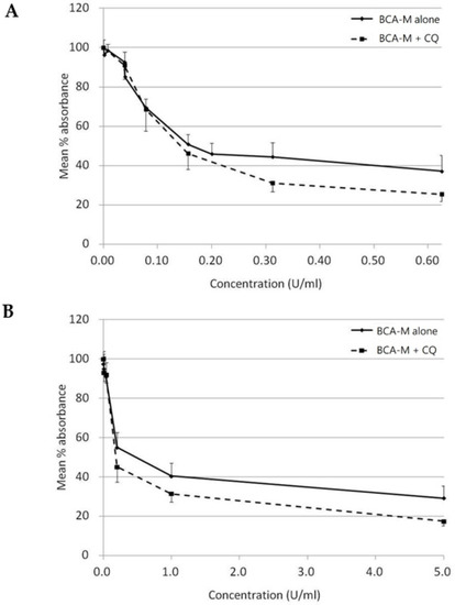 Growth inhibitory effect of BCA-M was enhanced synergistically by its combination to CQ on HeLa and SiHa human cervical cancer cells. The results of cell proliferation assay were represented by the mean % absorbance and S.D. (A) For SiHa cells, BCA-M was 2-fold serially diluted from 0.625 U/mL with or without combination to CQ starting at 6.25 μM and serially diluted along with BCA-M to maintain a constant ratio between the drugs. (B) For HeLa cells, constant drug ratio approach was also used with the starting concentration of BCA-M at 5 U/mL and CQ at 25 μM. In both cases, the combination of CQ enhanced the growth inhibitory effect of BCA-M.