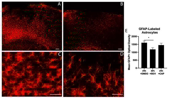 Antagonizing macrophage migration inhibitory factor (MIF) inhibits traumatic brain injury (TBI)-induced astrocytosis. Glial fibrillary acidic protein (GFAP)-labeling in peri-lesion cortex at 3 days after an FPI. In (A), GFAP+ astrocytes from an FPI mouse treated with DMSO vehicle at 30 min after FPI. In (B), GFAP+ astrocytes from an FPI mouse treated with ISO1 at 30 min after FPI. In (C), a higher magnification view or astrocytes from an FPI + dimethyl-sulfoxide (DMSO) mouse to highlight the number and appearance. In (D), a higher magnification view of astrocytes from an FPI + ISO1 mouse. Note that FPI causes robust astrocyte activation at 3 days after FPI. Also note that although the ISO1 treatment appears to have reduced the overall GFAP-labeling in this region, some of the astrocytes still appear to be activated. In (E), graph of the mean optical density of GFAP-labeling in peri-lesion cortex shows that ISO1 treatment significantly decreased GFAP-labeling, compared to vehicle treated mice (* p < 0.05). Scale bars = 250 µm in A and B, and 100 µm in C and D.