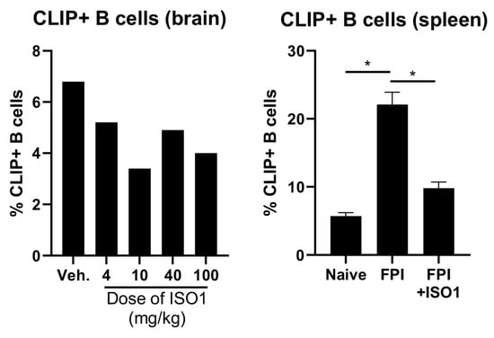 Dose–response curve of ISO1 given at 30 min after FPI, examining immune cell penetration into the brain at 24 h after FPI. We administered ISO1 at 30 min after FPI and performed flow cytometry on leukocytes isolated from the brain to ascertain the optimum dose of ISO1 and to assess what percentage of isolated are CLIP+ B cells. It should be noted that very few cells were isolated from naïve mice, so that was removed from the graph. Cells were stained with anti-CD19 and counter-stained with Anti-MHC class II invariant chain CLIP. The results indicate that a 10 mg/Kg dose of ISO1 administered 30 min after FPI provided the most robust decrease in % of B cells that express CLIP (* p < 0.05).