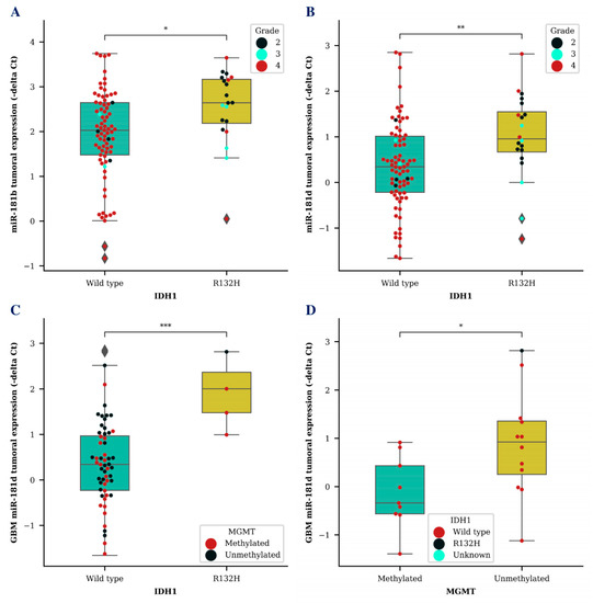 MiR-181b and miR-181d tumoral expression level association with known glioma biomarkers. Tumoral miR-181b (A) and miR-181d (B) expression differences between glioma patients (A,B) or GBM patients (C) with IDH1 wildtype and IDH1 R132H variant. Tumoral miR-181d levels in GBM patients with methylated MGMT promoter and unmethylated MGMT promoter status (D). Colored dots represent different IDH1 R132H variant (D) or MGMT promoter methylation status (C) and glioma grade (A,B). The box squares represent the data within 25 and 75 percentiles; the line in the middle shows the median.