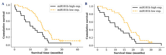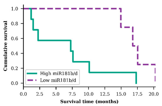 In order to evaluate miR-181b/d exosomal expression as a prognostic biomarker, GBM patients were grouped into two specific groups: group A—GBM patients who were older than 55.3 years, had IDH1 wild-type genotype, a hypermethylated MGMT promoter, and higher than median miR-181b/d exosomal expression; group B—the same previous criteria but with a lower than median miR-181b/d exosomal expression. A significant difference in patient survival time was observed within these two small GBM patient groups. Patients from group A (n = 7), on average, survived 2.36 times shorter than patients from group B (n = 4) (p = 0.025; df = 1; χ2 = 4.989) (Figure 4).