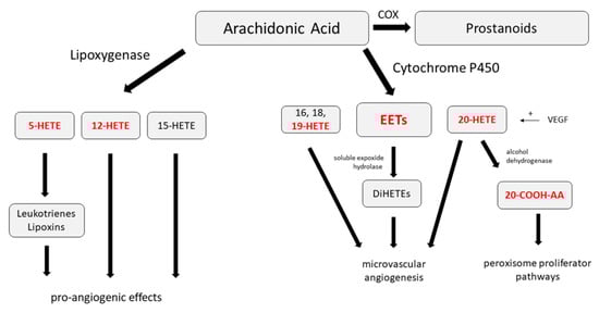 Cytochrome P450 enzymes lead to the formation of 18-19-, and 20-HETE, and stimulates microvascular angiogenesis [,,,]. VEGF increases 20-HETE production (Figure 1), and blockade of the formation of 20-HETE prevents the angiogenic effects of VEGF []. 20-carboxy-arachidonic acid (20-COOH-AA) is a metabolite of 20-HETE formed by the actions of alcohol dehydrogenase. It is a dual activator of the alpha and gamma peroxisome proliferator pathways that has been implicated in mediating vasodilation [,].
