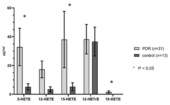 Human vitreous levels of eicosanoids in PDR (n = 31) vs. control (n = 13) eyes. Comparison of levels (pg/mL) of 5-HETE, 12-HETE, 15-HETE, 12-HETrE, and 19-HETE in PDR vs. controls. * denotes statistical significance (p < 0.05).