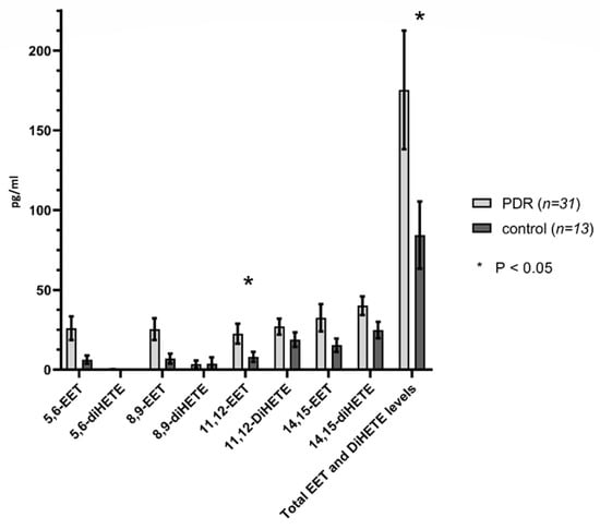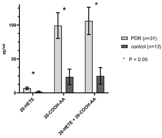 Mean values ± 1 standard error of measurement (SEM) are presented. The significance of differences in mean values of 20-HETE, 12-HETE, 5-HETE, 20-COOH-AA, 12-HETrE, 11,12-EET, 14,15-EET, 11,12-DiHETE, 14,15-DiHETE, EETs and DiHETEs and the sum of the concentration of 20-HETE plus its 20-COOH-AA metabolite derived from CYP450 ω-hydroxylase level in patients with proliferative diabetic retinopathy versus controls were compared using an unpaired t-test (two groups: PDR versus control) with Welch’s correction via statistical software (GraphPad Prism 8.01, GraphPad Software). A p value < 0.05 was considered statistically significant.