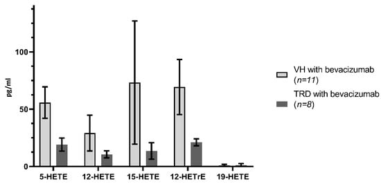 Human vitreous levels of eicosanoids in PDR subtypes treated with bevacizumab, VH (n = 11) vs. TRD (n = 8) eyes. Comparison of levels (pg/mL) of 5-HETE, 12-HETE, 15-HETE, 12-HETrE, and 19-HETE in VH vs. TRD.