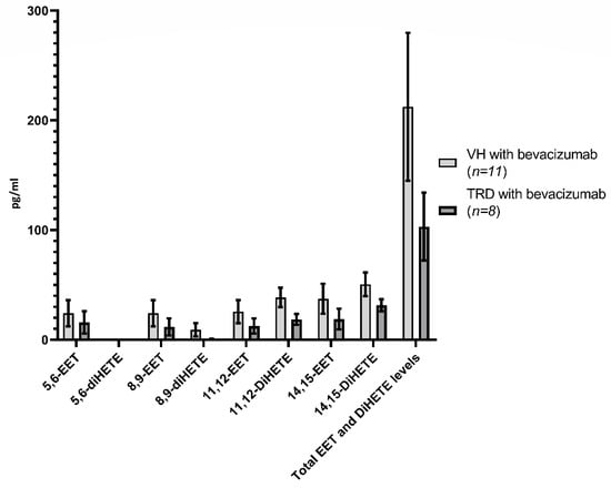 Human vitreous levels of eicosanoids in PDR subtypes treated with bevacizumab, VH (n = 11) vs. TRD (n = 8) eyes. Comparison of levels (pg/mL) of individual EET and DiHETE as well as total levels in VH vs. TRD.
