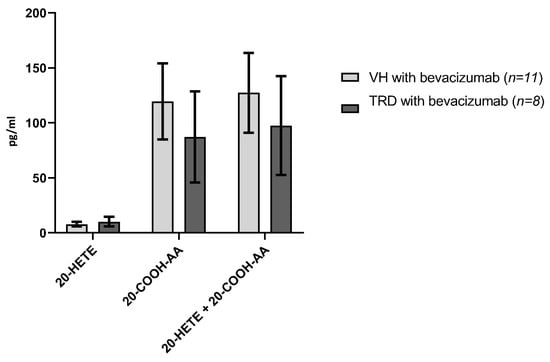 Guo et al. [] and Amaral et al. [] demonstrated that VEGF stimulates the production and release of 20-HETE and that 20-HETE serves as a downstream mediator of the angiogenic effects of VEGF. Indeed, inhibitors of the formation of 20-HETE prevented the angiogenic effect of VEGF applied to the cornea and following electrical stimulation in skeletal muscle [,]. Blockade of 20-HETE has also been shown to block the restenosis of carotid arteries following endothelial injury []. In the sub-analysis of bevacizumab-treated PDR eyes, 20-HETE levels were notably low and were not significantly different between TRD and non-TRD eyes (VH). Given the previous literature regarding the ability of VEGF to stimulate the production of 20-HETE, it is not surprising that blocking the VEGF receptor with a therapeutic antibody might be expected to decrease levels of 20-HETE. Additional work, however, is needed with larger sample sizes to better understand the relationships between 20-HETE and VEGF production and their interactions in the eyes of patients with PDR.