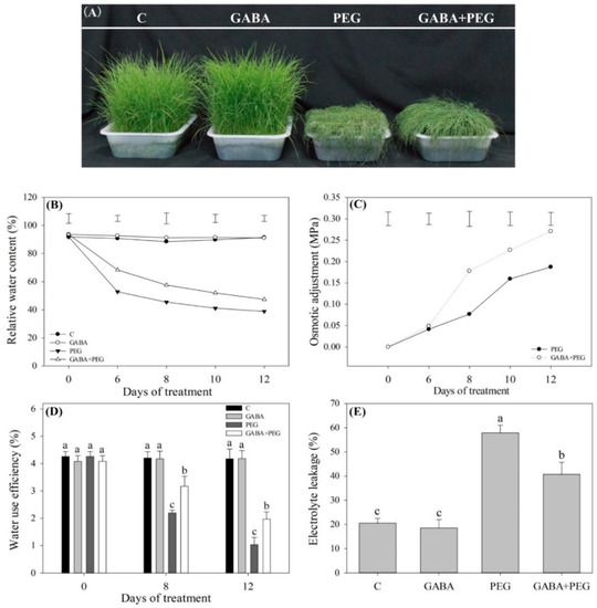Effects of γ-aminobutyric acid (GABA) pretreatment on (A) phenotype, (B) relative water content (RWC), (C) osmotic adjustment (OA), (D) water use efficiency (WUE) and (E) electrolyte leakage (EL) in leaves of creeping bentgrass under non-stress and water stress conditions. Vertical bars above curves in (A) or (B) represent the least significant difference (LSD) values at a particular day (n = 4; P ≤ 0.05). Vertical bars above the columns in (C) or (D) indicate ± SE of mean (n = 4) and different letters above columns indicate significant difference at a particular day based on the LSD (P ≤ 0.05). C, well-watered control; GABA, well-watered control pretreated with GABA; PEG, PEG-induced water stress; GABA + PEG, water-stressed plants pretreated with GABA.